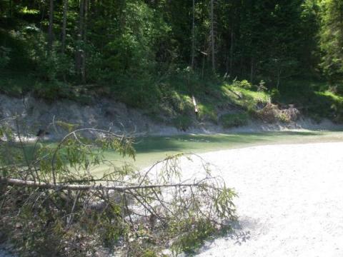 - Links ist ein kleiner Parkplatz, von dem aus man mit ein paar Schritten zur unteren Grenze, oberhalb der Mündung der Jachen in die Isar, dem „Isarspitz“ kommt.